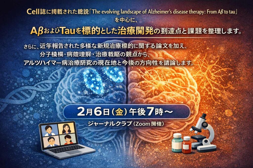 昨年12月24日にCellに、The evolving landscape of Alzheimer’s disease therapy: From Aβ to tauと題する総説が発表されました(https://www.cell.com/cell/fulltext/S0092-8674(25)01368-6)。レカネマブをスタートとするAβとTauを標的にした治療法をうまくまとめているので、この総説論文を中心に、最近発表された様々な新しい治療標的論文を加えて、ジャーナルクラブを2月6日午後7時から「最新のアルツハイマー病治療論文紹介」と題してZoomで開催します。