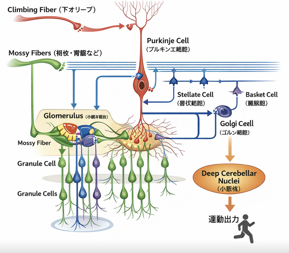 小脳は美しい構造を持っており、これをイメージして貰うため、GPTが書いたイラストを添えておくので、これを見ながら読んでほしい。断っておくが、私の使っているGPTから生成されるイラストは日本文字がおかしいので、そこは無視してほしい。