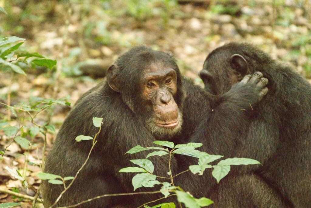 今の子供たちはもはや知らないと思うが、我々の子供時代のヒーローの一人はアフリカのターザンで、いつもチンパンジーのチータと協力しながら難局を乗り越えるのが映画で描かれた。そのためか、チンパンジーは元々愛らしい動物というイメージが染みついてしまっている。これを打ち破ったのが昨年亡くなった京都賞受賞者ジェーン・グドールで、チンパンジーの異なるグループ間では、互いに殺し合う抗争が見られるという報告だ。実際、ウガンダにチンパンジーやマウンテン・ゴリラを見に行ったとき、ゴリラは安全だがチンパンジーは極めて危険な動物なので注意するよう教えられた(図はキバレで撮影したグルーミングするチンパンジー)。